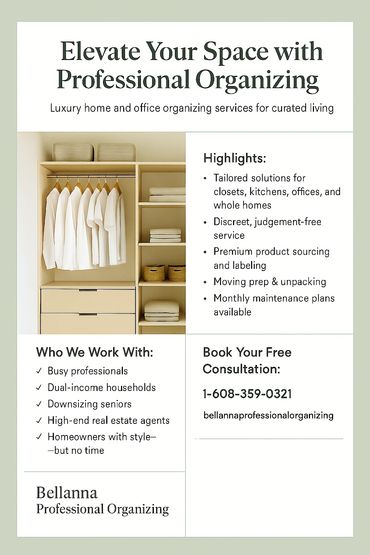 If clutter is causing you stress or you simply don't have the time to keep things in order, Bellanna Professional Organizing is here to transform your space into a calm, functional sanctuary.
